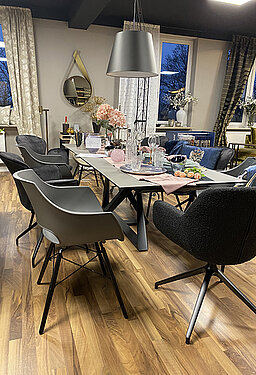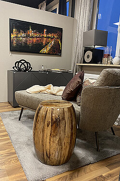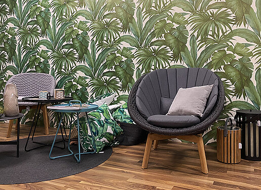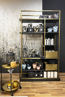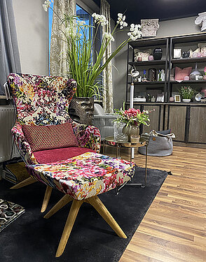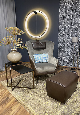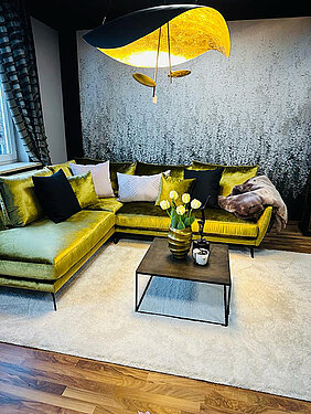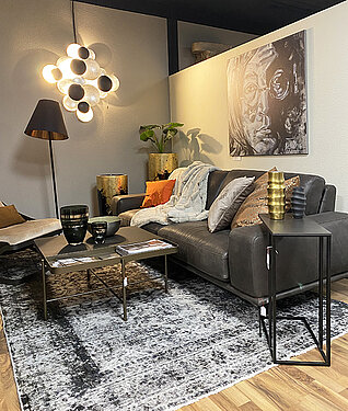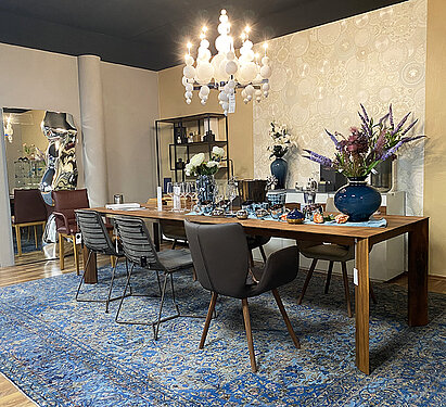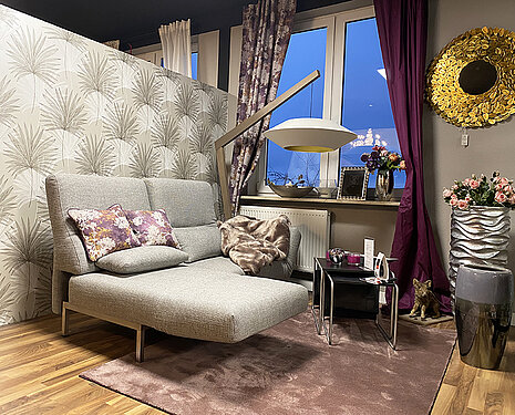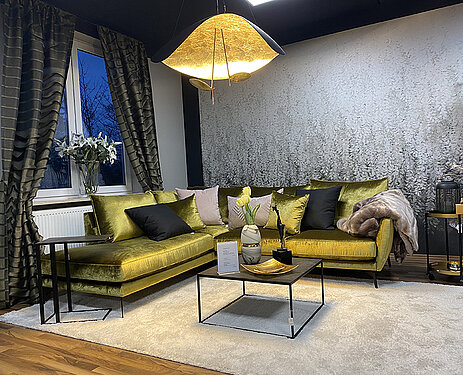 Die Fotos zeigen einen kleinen Teil der ausgestellten Möbelstücke sowie Tapeten, Gardinen, Leuchten und Teppiche.